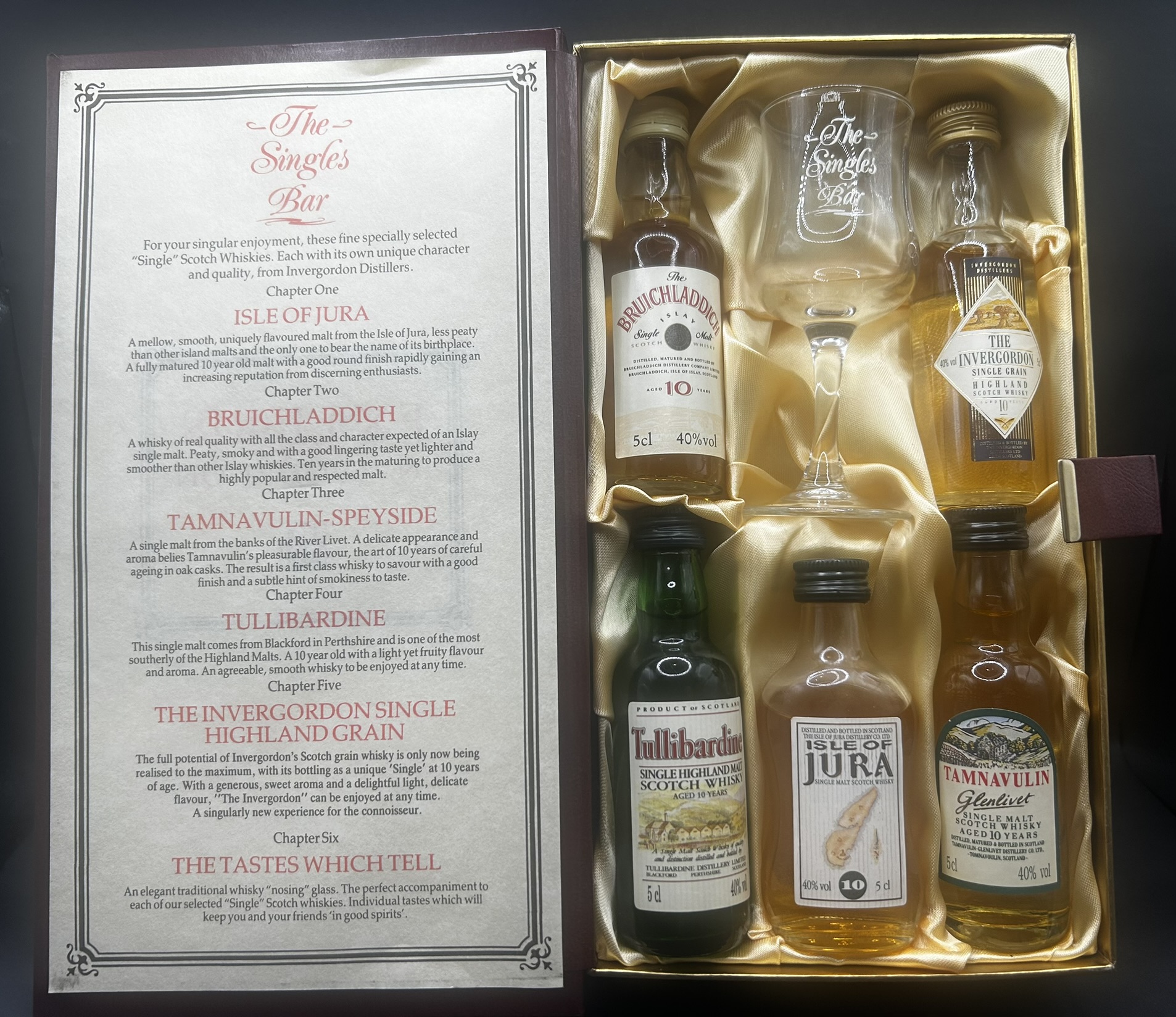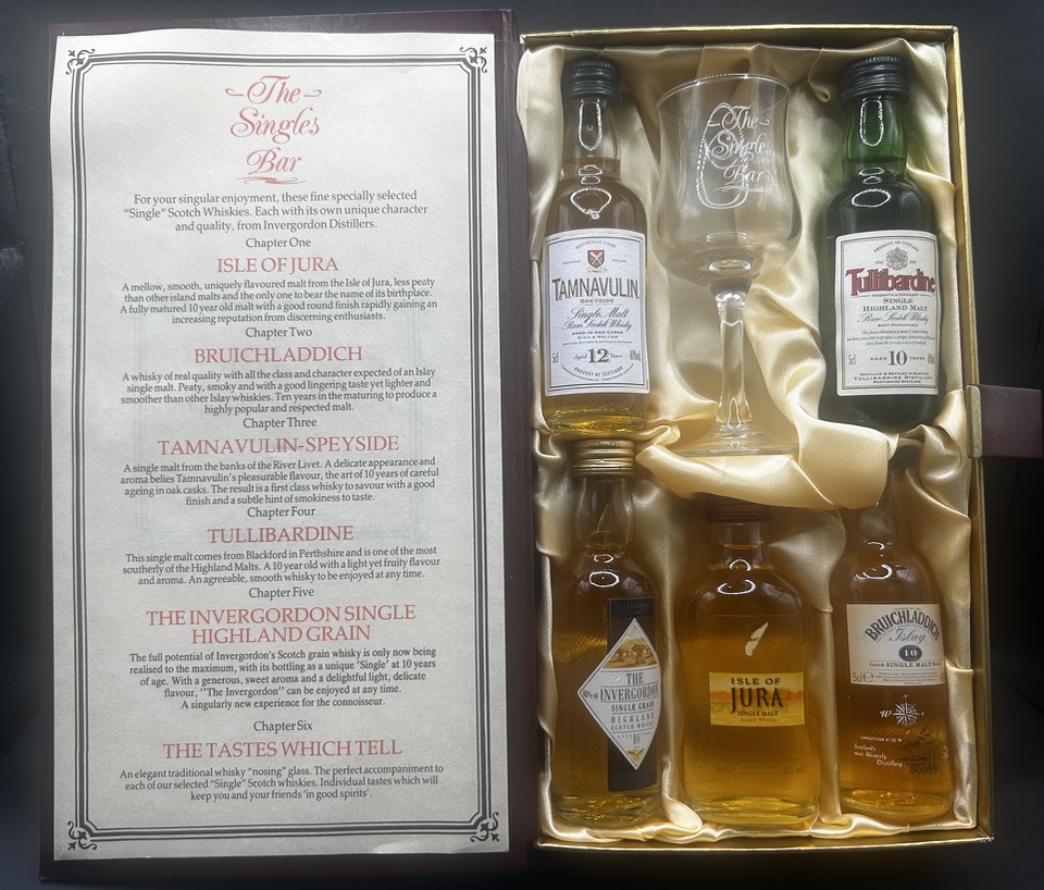 Section 9 – a Box set but one issued when Bruichladdich was part of the Invergordon Distillers Group. This set includes a 5cl miniature from various distilleries within the Invergorden portfolio as well a tasting glass. There are 2 different versions of miniature included, providing a timeline guide that these were issued in the mid-late 1990’s.